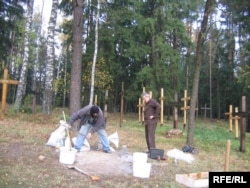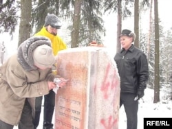 Сем здымкаў пра вандалізм у Курапатах ахвяравала нам спадарыня Ганна Соўсь. Мы паказваем тут тры характэрныя фатаграфіі. На здымку 128 сябры КХП БНФ ачышчаюць апаганены вандаламі помнік у памяць расстраляных габрэяў за часы сталінскага камуністычнага тэрору.