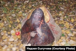 На здымку 114 фіксацыя самадзейнай творчасьці на камяні ў Курапатах. Здымак прыдатны для матэрыялаў пра Курапаты, распавядае пра існую рэчаіснасьць.