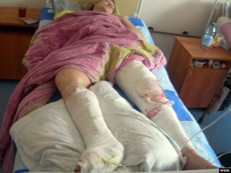 У адной з палат — 28-гадовая Ліля Мельнік, якая апынулася каля самага цэнтру выбуху. У яе моцна пацярпелі ногі, яна ня можа нават сядзець. Кажа, што выбухнула, калі яна сядзела на пледзе і размаўляла праз тэлефон. Выбуховае прыстасаваньне нібыта было ў скрынцы з-пад соку.