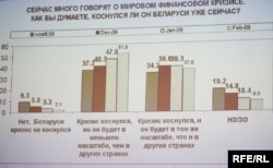 Спадарыня Яфімава адзначыла: лябараторыя пачала сваё дасьледаваньне ў лістападзе мінулага году. І таму сёньня ўжо можна казаць пра пэўную дынаміку зьмены грамадзкай думкі. Калі ў лістападзе 9% беларусаў лічылі, што крызіс абмінуў краіну, то ў лютым колькасьць аптымістаў скарацілася да 2%.