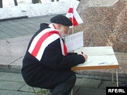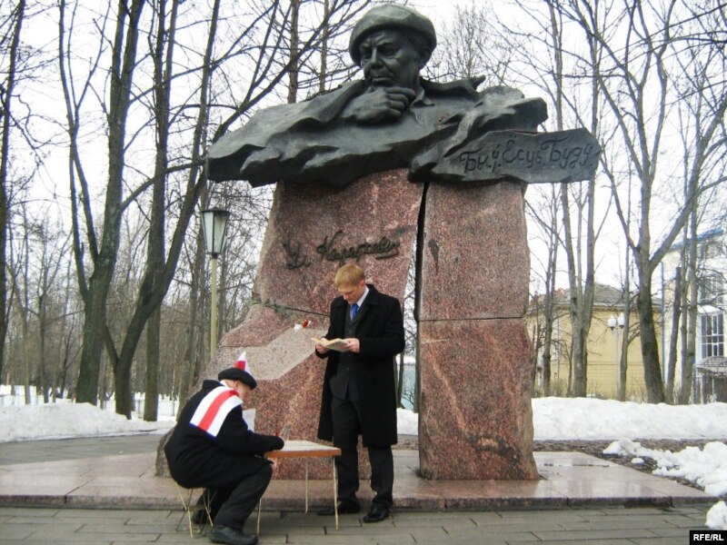 Віцебскі апазыцыянэр Барыс Хамайда пісаў сёньня агульнанацыянальную дыктоўку каля помніка Ўладзімеру Караткевічу. Тэкст яму дыктаваў сябар КХП БНФ Сяргей Каваленка.