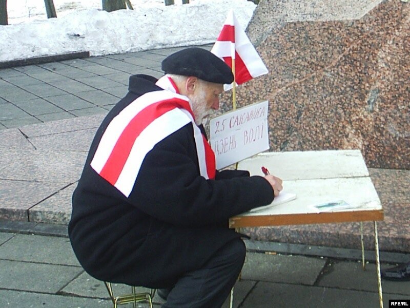 Барыс Хамайда ўладкаваўся за раскладным столікам, на які паставіў бел-чырвона-белы сьцяжок. На шыі ў апазыцыянэра быў бел-чырвона-белы шалік.