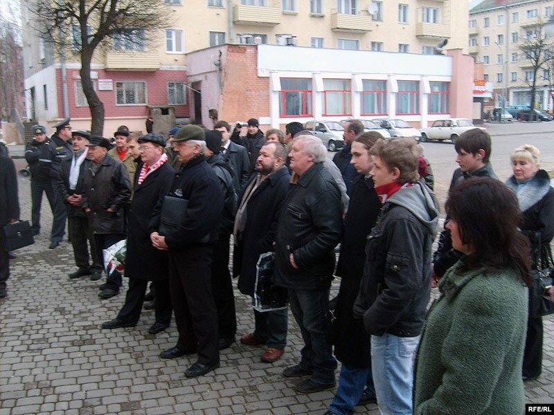 Калі празь некалькі хвілін да помніка пад’ехала міліцэйская машына, менавіта гэтыя атрыбуты начальнік міліцыі грамадзкай бясьпекі Кастрычніцкага раёну Аляксандар Каліноўскі кваліфікаваў як адзнаку несанкцыянаванага пікету. Спробы пераканаць міліцыянта нічога не далі: