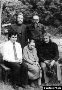 У гасьцях у Зоські Верас. 1985 год. Стаяць Генадзь Сагановіч і Лявон Луцкевіч. Сядзяць Эдвард, Зоська Верас, Сяржук Сокалаў-Воюш.