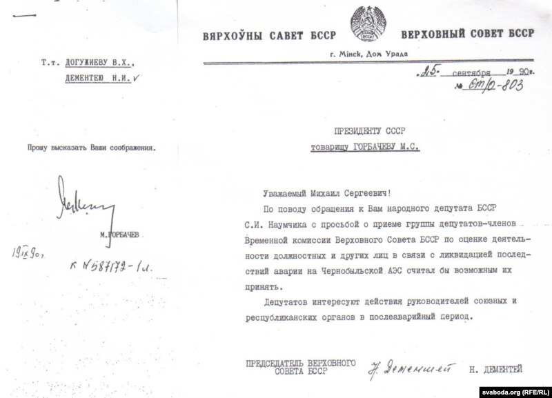 19 верасьня Гарбачоў падпісаў рэзалюцыю віцэ-прэм’еру СССР Віталю Дагужыеву і старшыні ВС БССР Мікалаю Дземянцею: “Прашу выказаць Вашы меркаваньні”.
