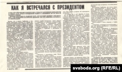 Тут ізноў спыню пераказ дваццацігадовай публікацыі. Стаўшы перад дзьвярыма, я пачаў шукаць Гарбачова – з пакоя чуўся голас Дземянцея, лягічна, што ён быў побач з высокім госьцем. Чалавек, які стаяў перада мной сьпінай і папраўляў шалік, абярнуўся… і аказаўся Гарбачовым. Потым мне патлумачылі, што я рызыкаваў – ахова не павінна была дапусьціць незнаёмага чалавека на такую блізкую адлегласьць і мела поўнае права “дзейнічаць”. Але, думаю, уратаваў дэпутацкі значок ВС, ды і за апошнія гады ахоўнікі прызвычаіліся да “незаплянаваных” суразмоўцаў свайго “аб’екту”.