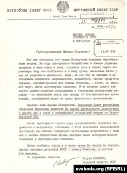 Думаю, Гарбачоў прачытаў толькі тое, што падкрэсьліў у лісьце невядомы мне ягоны рэфэрэнт: “Вярхоўны Савет рэспублікі ўтварыў Часовую камісію па ацэнцы дзейнасьці службовых і іншых асобаў у сувязі зь ліквідацыяй наступстваў аварыі на Чарнобыльскай АЭС… калі і ў які час Вы маглі б прыняць групу народных дэпутатаў БССР – членаў Камісіі, у складзе 3-4 чалавек?”