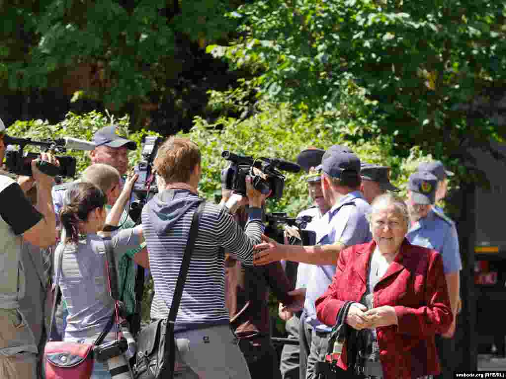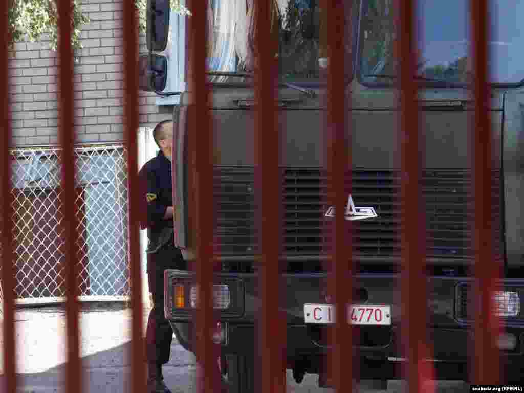 Жонку журналіста Аксану Пачобут з дзіцём на руках ў тамбуре суду не пускае ўнутр міліцыянт