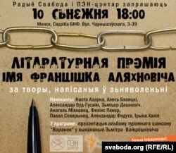 10 сьнежня а 18-й гадзіне ў менскай Сядзібе БНФ (Чарнышэўскага, 3-39) адбудзецца цырымонія ўганараваньня ляўрэатаў літаратурнай прэміі Францішка Аляхновіча за творы, напісаныя ў зьняволеньні.