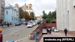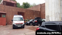 Каля Ўкраінскага дома дзяжураць некалькі машын хуткай дапамогі і паліцыі.