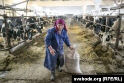 Жанчыны разьбіраюць мяхі з кармамі — кожны па 30–40 кіляграм. На кожную — 50–60 кароваў. Даярчына праца — карміць, мыць, даіць, цягаць вёдры з малаком. Каровы жуюць сена, лётаюць галубы, праз уваход відаць марозны ружовы сьвітанак — атмасфэра на фэрме амаль біблейская, каб ня рэзкі пах гною і не ператомленыя твары і паставы даярак.
