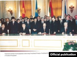 На фота падпісаньня дамовы аб інтэграцыйных сувязях паміж Беларусьсю Казахстанам і Кыргызстанам за сьпіной Аляксандра Лукашэнкі стаяць ня толькі раней згаданы прэмʼер Міхаіл Чыгір, адзіны прэмʼер Беларусі, які пакінуў сваю пасаду на знак пратэсту, але і тагачасны старшыня Вярхоўнага Савету Беларусі 13-га скліканьня Сямён Шарэцкі. 21 ліпеня 1999 дэпутаты ВС 13-га скліканьня, прыхільнікі Канстытуцыі 1994 году, прызначылі Шарэцкага выканаўцам абавязкаў прэзыдэнта Беларусі. З канца ліпеня 1999 году Сямён Шарэцкі жыў у Вільні, лічыўся легітымным кіраўніком Беларусі, пазьней эміграваў у ЗША.
