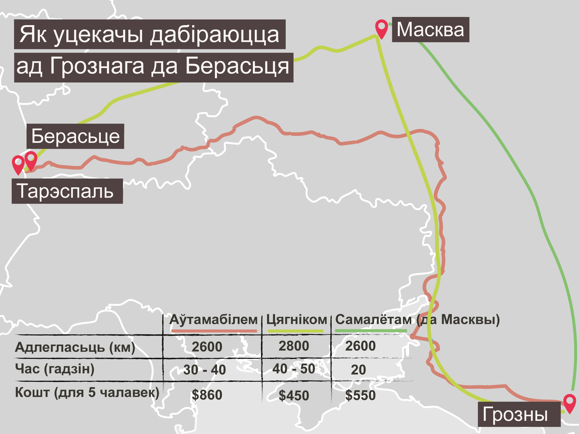 Грозны — Берасьце — гэта ўжо рэгулярны маршрут для чачэнскіх таксістаў. За 2,5 тысячы кілямэтраў у адзін бок яны бяруць 10 тысяч расейскіх рублёў з чалавека (170 даляраў). Усёй сям’і паездка каштавала 840 даляраў.
