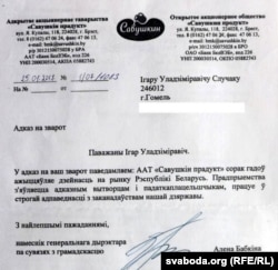 Намесьніца генэральнага дырэктара па сувязях з грамадзкасьцю ААТ «Савушкін прадукт» Алена Бабкіна на маю прапанову паклапаціцца і пра правы беларускамоўных спажыўцоў адказала зусім цьмяна і не па сутнасьці звароту, паведаміўшы, што «„Савушкін“ прадукт» 40 гадоў ажыцьцяўляе дзейнасьць на рынку Беларусі. Прадпрыемства зьяўляецца адказным вытворцам і падаткаплатнікам, працуе ў строгай адпаведнасьці з заканадаўствам нашай дзяржавы».