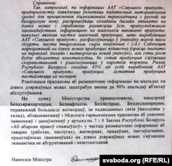 «Па інфармацыі ААТ „Савушкін прадукт“ прадпрыемству давядзецца ўкладаць дадатковыя матэрыяльныя сродкі для прыцягненьня ліцэнзаванага перакладчыка з расейскае мовы на беларускую мову, распрацоўваць складаны дызайн этыкеткі на дзьвюх мовах і спрабаваць разьмясьціць усю прадугледжаную заканадаўствам інфармацыю на маленькай упакоўцы прадукту, паколькі вялікая частка малочнай прадукцыі, што вырабляецца ААТ „Савушкін прадукт“, расфасоўваецца ва ўпакоўку малой масы (ёгурты, пасты тварожныя, сыры плаўленыя і г. д.). Сабекошт маркіраванай на дзьвюх мовах прадукцыі відавочна ўзрасьце (выдаткі на пераклад, дызайн і вытворчасьць новай упакоўкі), але гэты рост будзе абсалютна немэтазгодны, бо гэтая прадукцыя зьяўляецца скорапсавальнай і рэалізоўваецца ў кароткія тэрміны. Рынак Беларусі складае 45% ад усёй вырабленай ААТ „Савушкін прадукт“ прадукцыі, астатняя прадукцыя пастаўляецца на экспарт».