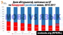 На 100 балаў здалі беларускую мову 0,12% абітурыентаў, расейскую — 0,08%. Пры гэтым доля абітурыентаў, якія здавалі беларускую мову, вырасла ўпершыню за сем гадоў за кошт таго, што абітурыентам дазволілі запісвацца адначасова на тэсты і па беларускай мове, і па расейскай.