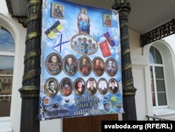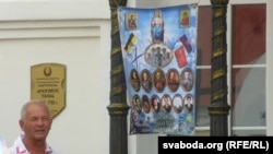 З прамоваю выступіў старшыня Магілёўскага гарвыканкаму Ўладзімер Цумараў. Чыноўнік не зьвярнуў увагі на плякат з расейскай манархічнай сымболікай, якую вывесілі непадалёк ад яго.