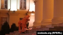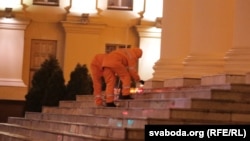 Пасьля заканчэньня акцыі, цягам некалькіх хвілінаў, да ганку КДБ прыбылі камунальшчыкі. Яны ачысьцілі прыступкі ад зьнічоў, перашкаджаючы фотакаспандэнту Свабоды здымаць іх дзеяньні.