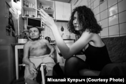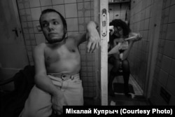 Няёмкія моманты былі: напрыклад, я баялася легчы Віцю на калені. Я важу 50 кіляграмаў — баялася яму нешта паламаць. Часу на тое, каб звыкнуцца, было мала, гэта ж незнаёмае цела — ня так проста, каб атрымалася жывое. Далей мы стараліся фатаграфаваць жывыя моманты, перасоўваньні, любыя прапановы, і проста калі людзі камунікавалі паміж сабой.