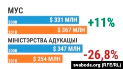 Таксама за дзесяць апошніх гадоў на чвэрць зьнізілася фінансаваньне Міністэрства культуры — з 76 мільёнаў даляраў у 2008 годзе да 56,6 мільёна ў 2018-м. Прыкладна такія ж страты ў Міністэрства адукацыі. Выдаткі на дзейнасьць гэтага ведамства скараціліся з 347 мільёнаў у 2008 годзе да 254 у 2018-м (-27%).