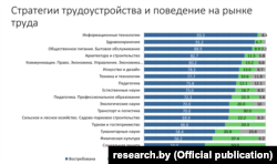 Як паводзяць ці як мяркуюць паводзіць сябе на рынку працы выпускнікі школ? Самыя папулярныя і запатрабаваныя спэцыяльнасьці ў іх — у сфэры інфармацыйных тэхналёгій (93,3%) і аховы здароўя (91,2%).