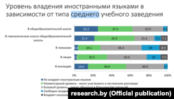 Паводле Дарʼі Урбан, яшчэ адзін паказальнік узроўню адукацыі — ступень валоданьня замежнымі мовамі. 36,7% вучняў агульнаадукацыйных школ валодаюць замежнай мовай на элемэнтарным узроўні, і 25% — не валодаюць.