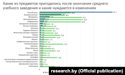 Падчас дасьледаваньня вывучалася каштоўнасьць сярэдняй адукацыі ў Беларусі. Тры прадметы, якія найбольш спатрэбіліся выпускнікам пасьля заканчэньня школы, — расейская мова (53,7%), беларуская мова (16,1%), і матэматыка (7,6%).