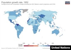Інфаграфіка ў цытаваным артыкуле дазваляе паглядзець дынаміку росту народанасельніцтва. Вось як выглядала адпаведная мапа ў сярэдзіне мінулага стагодзьдзя — у далёкім 1952 годзе.
