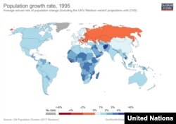 Мапа 1995 году насамрэч ужо вельмі падобная да мапы 2015 году. Лічбы ў пэўнай ступені зьмяніліся, у Беларусі за 1995 год насельніцтва зьменшылася на 0.32%, у 2015 годзе — на 0.02%.