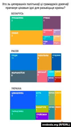 Апытаньне паказала, што для беларускай моладзі няма палітычных лідэраў. Самыя папулярныя палітыкі, якія, на думку моладзі, могуць прапанаваць новыя ідэі, — гэта Аляксандар Лукашэнка і прэм’ер-міністар Румас. Разам яны набралі 3%. У Расеі і Ўкраіне дзейныя палітыкі таксама непапулярныя, але яны маюць большы працэнт.