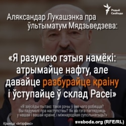 «Я разумею гэтыя намёкі: атрымайце нафту, але давайце разбурайце краіну і ўступайце ў склад Расеі, — казаў Лукашэнка. — Я заўсёды пытаю: такія рэчы ў імя чаго робяцца? Вы падумалі пра наступствы? Як на гэта паглядзяць у нашай і вашай краіне, і міжнародная супольнасьць? Ня кіем, дык палкаю інкарпаруюць краіну ў склад іншай краіны».