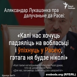 «Для нас, запомніце, сьвятое — гэта сувэрэнітэт, я ўжо пра гэта казаў, — цытуе Лукашэнку БелТА. — Гэта адносная незалежнасьць, я лічу, што абсалютна незалежных дзяржаваў няма. І вы таксама не настолькі незалежныя, але сувэрэнныя. Калі нас хочуць, як Жырыноўскі прапаноўваў, падзяліць на вобласьці і ўпіхнуць у Расею — гэтага ня будзе ніколі. і калі такімі катэгорыямі кіраўніцтва Расеі думае — гэта на шкоду самой Расеі».