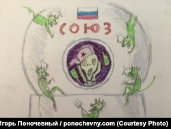 «Усе малюнкі Алёшы Ступіна ствараліся па нейкіх навінных нагодаў. Ёсьць падстава — ёсьць малюнак. Гэты малюнак я зрабіў пасьля ідэі Дзьмітрыя Рагозіна аб тым, што дзірку ў міжнароднай касьмічнай станцыі прасьвідраваў нейкі нядобразычлівец, спэцыяльна імкнучыся нашкодзіць Раскосмасу».