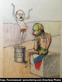 «Гэтую карцінку я намаляваў да апошняга прыезду Аляксандра Лукашэнкі ў Маскву, калі стала ясна, што ў яго пачаліся праблемы ў сувязі з рашэньнем расейскага ўраду павысіць цэны на нафту і газ для Беларусі, і Лукашэнка прыехаў да Пуціна дамаўляцца».