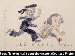 «Пасьля выступу віцэ-адмірала Мухаметшына я намаляваў такога вось марака, які перасьледуе Імануіла Канта, таму што ён ня ўпісваецца ў ягоную сыстэму каштоўнасьцяў. Яго ніхто не чытае, ён нікога не задавальняе, Кант нікому не патрэбны. Значыць, яго трэба прагнаць».