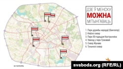 Цяперашняя рэдакцыя закону «Аб масавых мерапрыемствах» (абнаўленьне якога ўлады называлі «жэстачайшай лібэралізацыяй») дазваляе праводзіць у гэтых шасьці месцах у Менску мітынгі паводле паведамляльнага прынцыпу (у іншых гарадах улады таксама вызначаюць «дазволеныя месцы»).