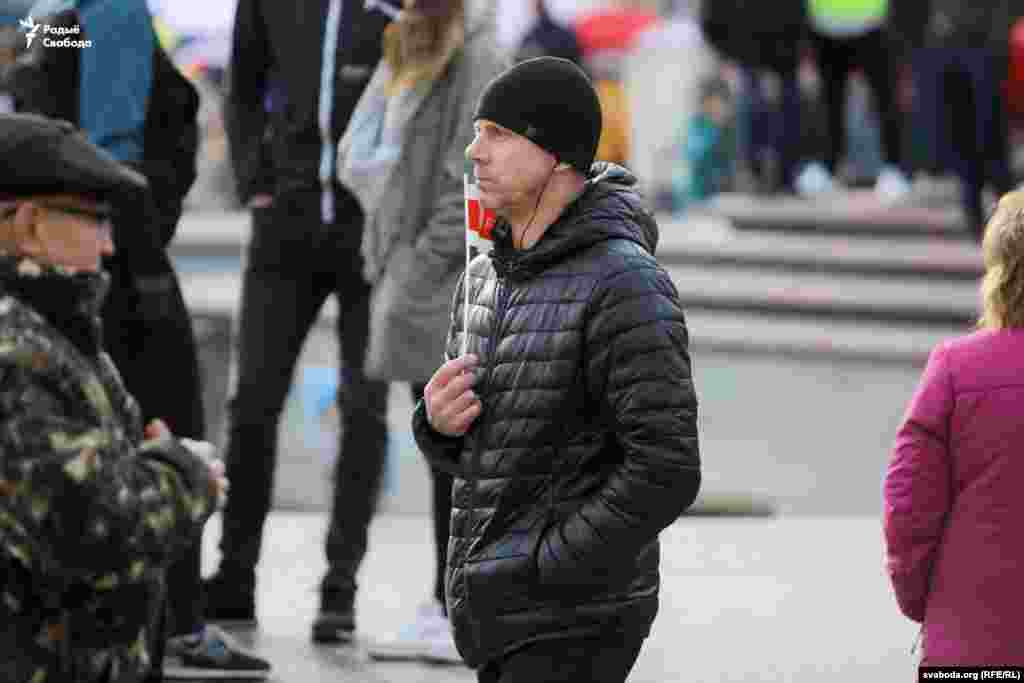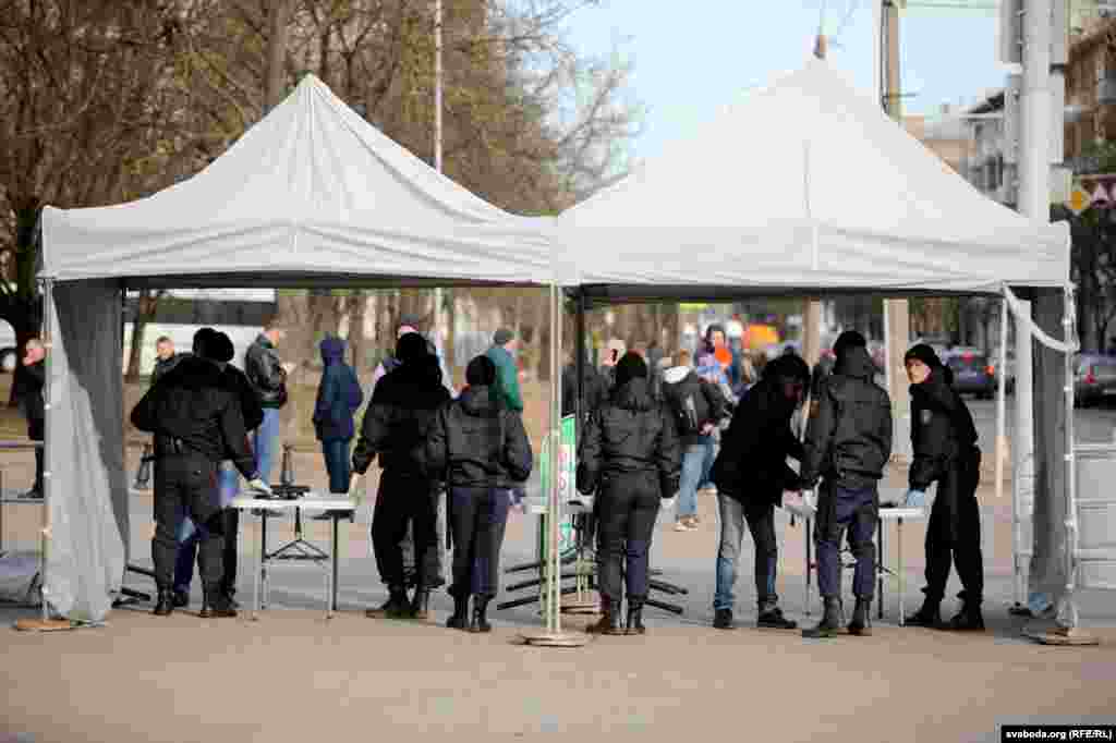 На выхадзе і на падыходах да пляцоўкі ў Кіеўскім сквэры міліцыянты патрабавалі ад наведнікаў, каб тыя хавалі бел-чырвона-белыя сьцягі.