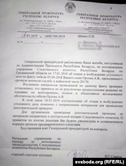 У канцы сакавіка родныя загінулага салдата нечакана атрымалі ліст з Генэральнай пракуратуры. Там гаворыцца, што гродзенскі абласны СК расьсьледаваў сьмерць Аляксандра Арлова не ўсебакова, няпоўна і неаб’ектыўна. І паведамляецца, што 18 сакавіка Генпракуратура прыняла рашэньне накіраваць матэрыялы справы аб гібелі салдата на дадатковую праверку. Ёй будзе займацца Цэнтральны апарат Сьледчага камітэту.