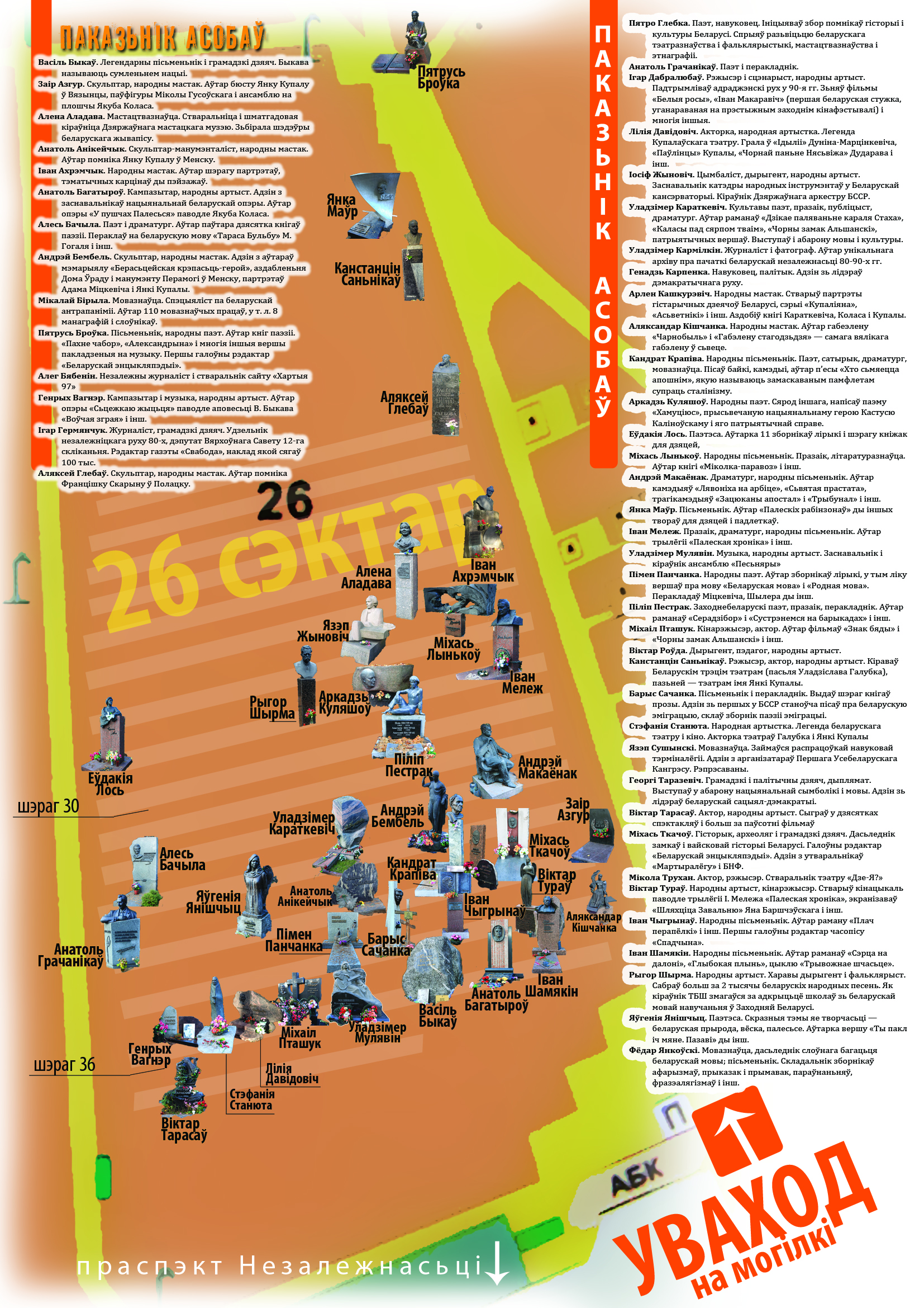 - Уладзімер Караткевіч. Паэт, празаік, публіцыст, драматург. Выступаў і абарону мовы і культуры. Аўтар раманаў «Дзікае паляваньне караля Стаха», «Каласы пад сярпом тваім», «Чорны замак Альшанскі», патрыятычных вершаў.