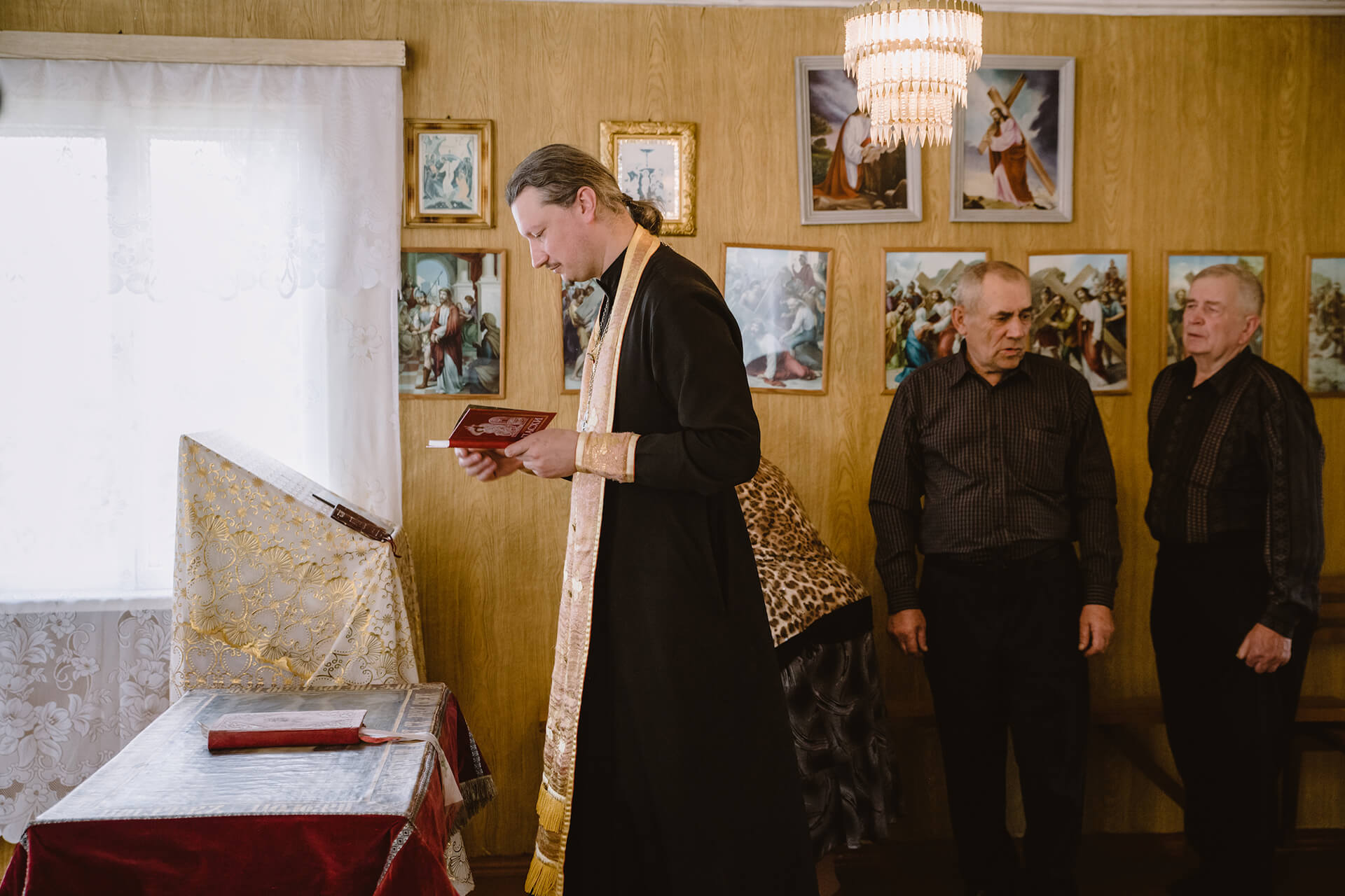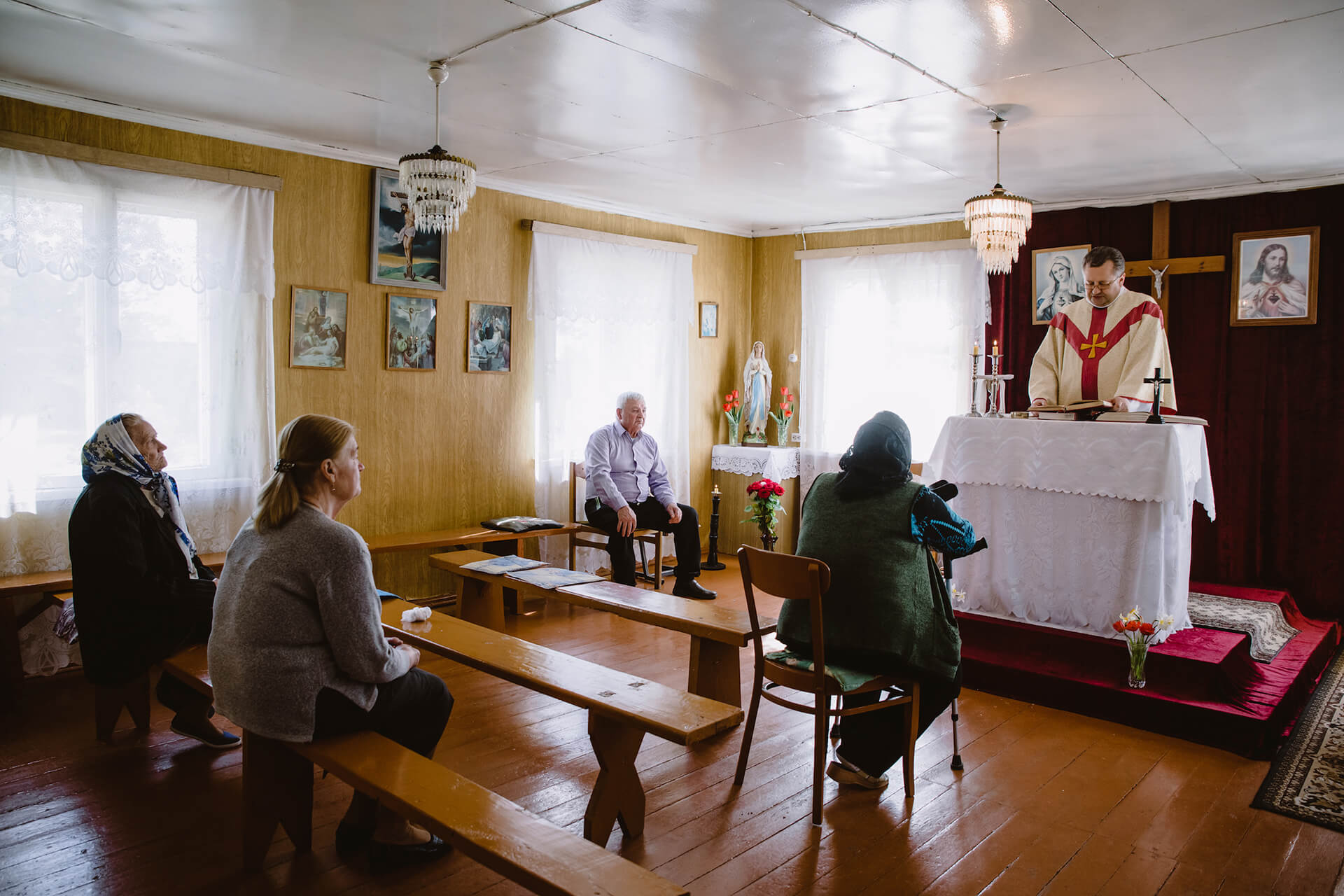 28 красавіка ў 16.00 прыбывае ксёндз Альмандас. У капліцы каля дзесяці чалавек. Парафіяне кажуць, што звычайна прыходзіць болей. Імша, камунія, збор ахвяраваньняў, і ўжо праз гадзіну каталікі сыходзяць, не замыкаючы капліцы.