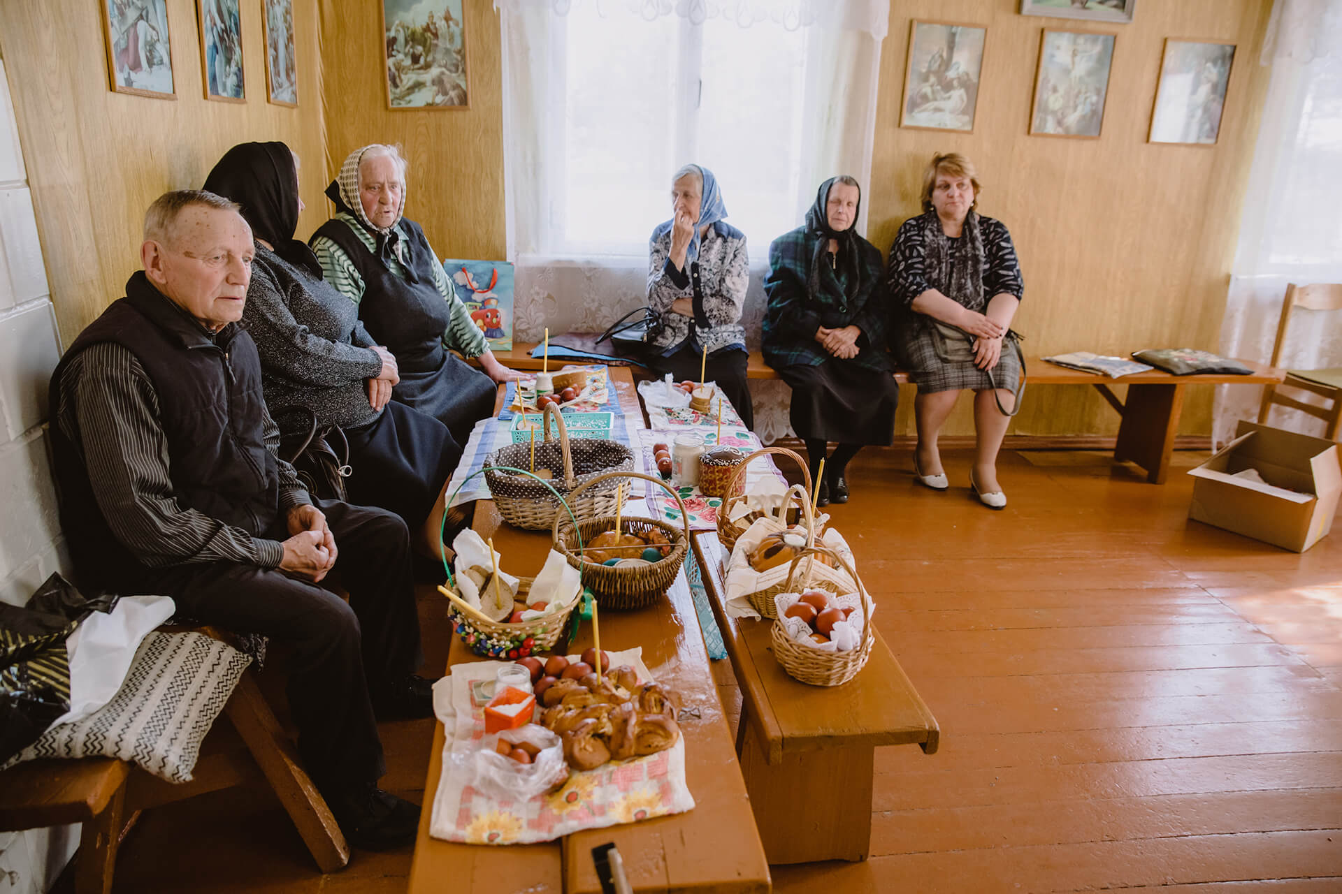 Да 17-й гадзіны пачынаюць падцягвацца праваслаўныя. Яны прыйшлі асьвяціць ежу перад Вялікаднем. Служба ў іх даўжэйшая. Хто сыходзіць апошнім, заносіць ключы каталічцы Валянціне, бо тая жыве бліжэй за ўсіх да капліцы.