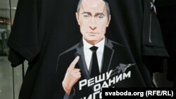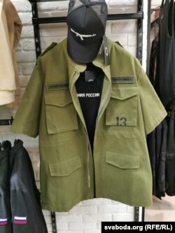 Адзеньне з надпісам «Армія Расеі» і «Вырашу адным мігам» з партрэтам прэзыдэнта Расеі Ўладзіміра Пуціна прадаецца ў цэнтры Менску ў краме пад брэндам расейскага рэпэра Цімаці.