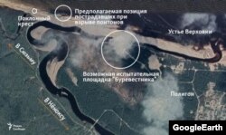 8 жніўня амэрыканскі Цэнтар вывучэньня праблем нераспаўсюджваньня у Мантэрэі апублікаваў спадарожнікавы здымак кампаніі Planet Labs, на якім відаць раён меркаванай аварыі. На здымку можна пабачыць разьмяшчэньне караблёў і пантонаў, якія ўдзельнічалі ў выпрабаваньнях. Калі параўнаць іх месцазнаходжаньне з фотаздымкамі пантонаў, знойдзеных Радыё Свабода, можна зрабіць выснову, што пасьля аварыі іх адцягнулі да берага — прычым вайскоўцы ня сталі заводзіць заражаныя радыяцыяй плывучыя плятформы на тэрыторыю сваёй часьці, а кінулі іх на беразе побач з папулярнай у мясцовых жыхароў дарогай. Магчыма, аднак, што пантоны папросту выкінула на бераг пасьля аварыі, як пра гэта кажа на відэа Ўладзімір Босы.