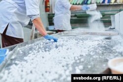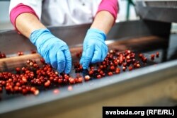 Лінія па вырабе журавін у цукровай пудры працуе на замову. Сёньняшняя партыя паедзе ў Швайцарыю. На пробу Жэнэва замовіла 60 скрыняў журавін у цукровай пудры і мармэляд зь дзікарослых ягад.