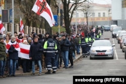 11:49 Зьявіўся міліцыянт з гукаўзмацняльнікам на скрыжаваньні вуліцы Леніна і праспэкту Незалежнасьці. Ён паведаміў, што акцыя несанкцыянаваная, просіць усіх разысьціся.