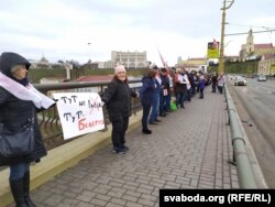 А 15:00 людзі расьцягнуліся ў ланцуг уздоўж мота і ўзяліся за рукі. Ланцуг быў карацейшы, чым сам мост. Удзельнікі трымалі бел-чырвона-белыя сьцягі і плякаты з надпісамі «Дзе Расея — там вайна», «Беларусь не прадаецца», «Народзе, тагды толькі зажывеш шчасьліва, калі над табою м.. ля [жыхар Масквы] ўжэ ня будзе. Кастусь Каліноўскі».