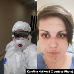 Інфэкцыяністка Кацярына Гашкава працуе ў Чэхіі ў Усьці-над-Лабай у інфэкцыйным аддзяленьні мясцовага шпіталя. На мінулым тыдні Кацярына расказала Свабодзе пра сваю працу з хворымі на каранавірусную інфэкцыю. 23 сакавіка Кацярына даслала Свабодзе фатаздымак, дзе можна пабачыць яе твар пасьля працоўнага дня.