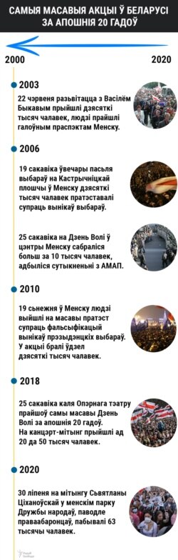 Мітынг у Менску 30 ліпеня стаў самым масавым за апошнія 10 гадоў. Але шматлюдныя акцыі праходзілі і раней. Найбольш людзей выходзіла на пратэсты ў 1996-м і 1999-м гадах. Калі ж лічыць за апошнія 20 гадоў, то самыя масавыя акцыі былі: