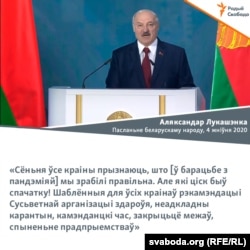 Аляксандар Лукашэнка заявіў 28 ліпеня, што «на нагах» і бессымптомна перанёс каранавірус. Увесь месяц перад гэтай заявай ён актыўна праводзіў сустрэчы і паездкі па Беларусі. Раней ён заяўляў, што «асабліва ня парыцца» наконт выяўленых выпадкаў каранавірусу. Лукашэнка не скасаваў вайсковы парад на 9 траўня, нават пасьля таго як ад удзелу ў тым парадзе адмовіліся вайскоўцы з Расеі і Кітаю, шэраг расейскіх палітыкаў. Прэзыдэнцкія выбары праз каранавірус ня сталі пераносіць, адмовіліся рабіць дыстанцыйнымі.
