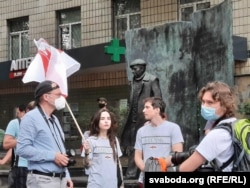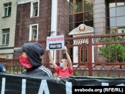 Асобна да амбасады прыйшлі беларускія добраахвотнікі, якія ваявалі за тэрытарыяльную цэласнасьць Украіны — яны таксама выступілі супраць фальсыфікацый і патрабавалі спыніць гвалт.